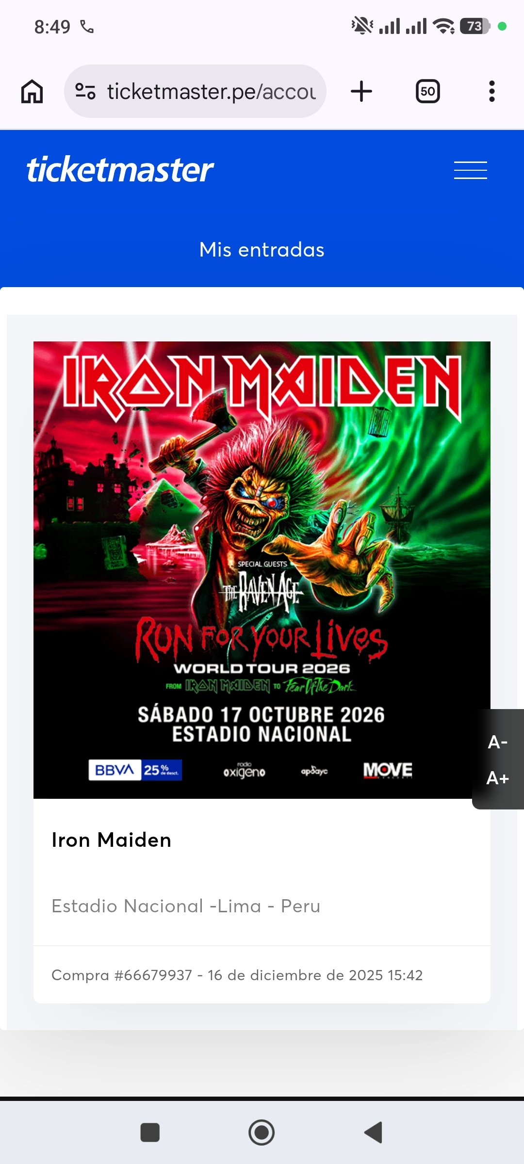 Iron maiden Perú, occidente baja Sección C númerada, precio regular (menos 50 soles que el regular) buena zona para presenciar el concierto, contacto directo con el comprador (yo), también asistiré pero para otra zona asi que no riesgos. Cualquier duda me la puede hacer si esta interesado.